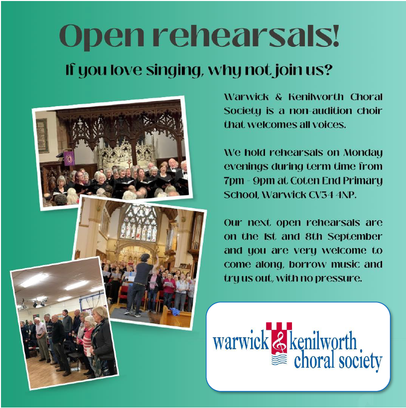Rehearsals have begun at Coten End Primary School, Warwick for our 2025-2026 season and on Monday, 8th September 2025 at 7pm, we’re holding our second open rehearsal of the new term. We’re rehearsing for our next concert in November – Bernstein’s Chichester Psalms and Dvořák’s Mass in D major.